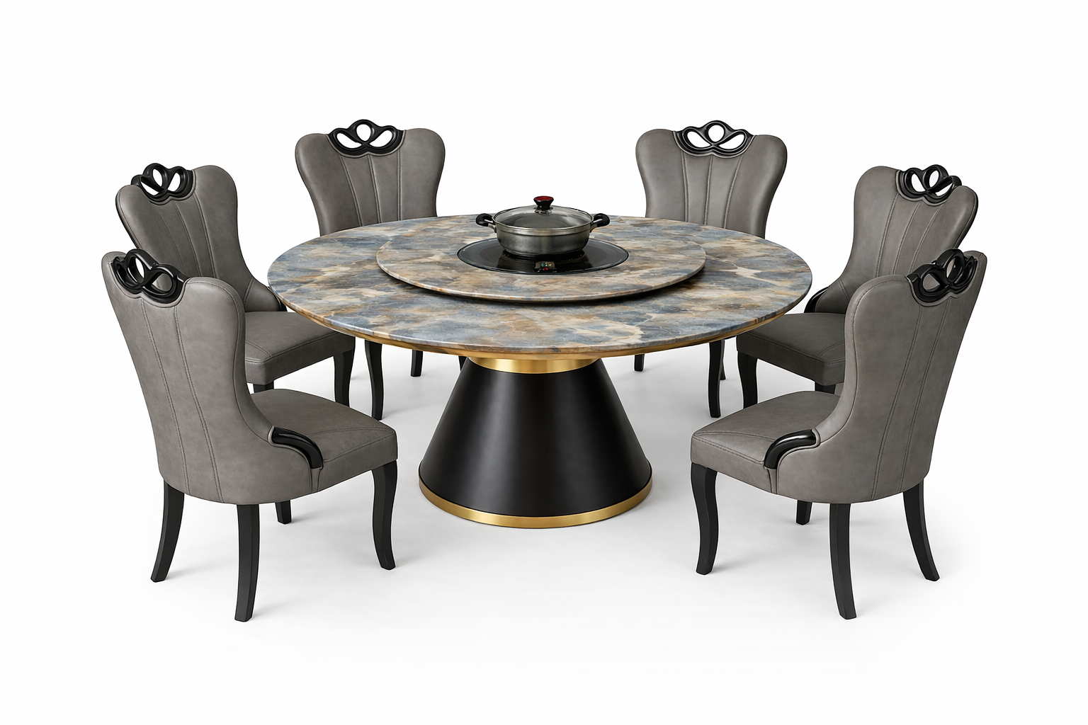 The centrepiece of this set is a beautifully crafted 1.5-metre round marble dining table, finished in an elegant blue-grey marble tone. Featuring a built-in induction cooker seamlessly integrated into the tabletop, it allows you to cook and serve hot meals directly at the table—perfect for family gatherings and special occasions.