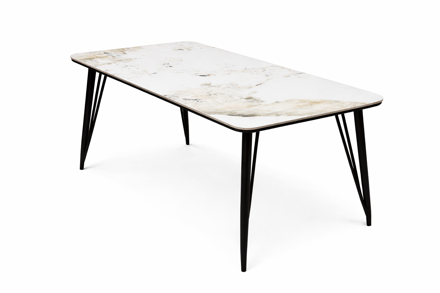 The table showcases a durable sintered stone top, reinforced with an integrated MDF painted base for a seamless and refined finish. Designed for everyday living, the tabletop is heat-resistant, scratch-resistant, and easy to clean. Sleek black painted metal legs provide strong support while adding a modern contrast that enhances any interior.